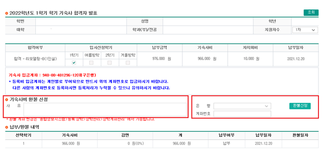 [재학생] : 종합정보시스템>등록장학>장학관리>장학계좌관리에서 입력을 한후 다시 환불신청을 하여야 합니다.